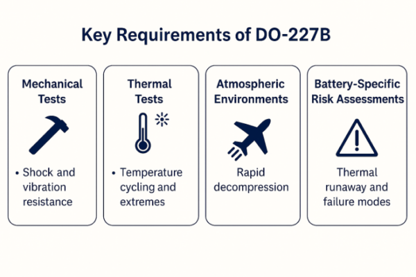 RTCA DO‑227B represents the state of the art for the safe design and qualification of non‑rechargeable lithium batteries in aviation. Through comprehensive testing requirements, clear design guidelines, and structured documentation criteria, it provides a solid foundation for certification and safe operation under all aviation conditions.